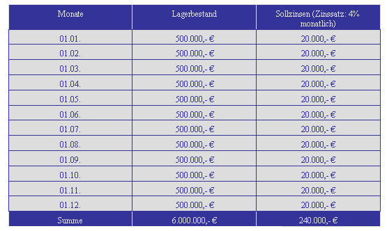 So betragen die jährlichen Sollzinsen insgesamt 600.000 € und werden als Lagerbestandskosten bei der internen Beschaffung erfasst.