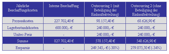 Der Kostenvergleich zwischen interner und ausgelagerter Beschaffung kann damit in folgender Tabelle dargestellt werden.