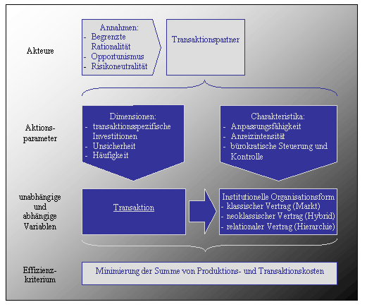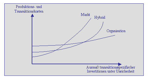 From the connection between independent and dependent variables the main statement of the transaction cost theory results: The market represents the most favourable organization form due to its strong incentives and the effectiveness of the competition mechanism, which opportunistic behavior makes limited and economical autonomous adjustment processes possible, if transactions are not connected with special uncertainty or transaction specific investments. 57