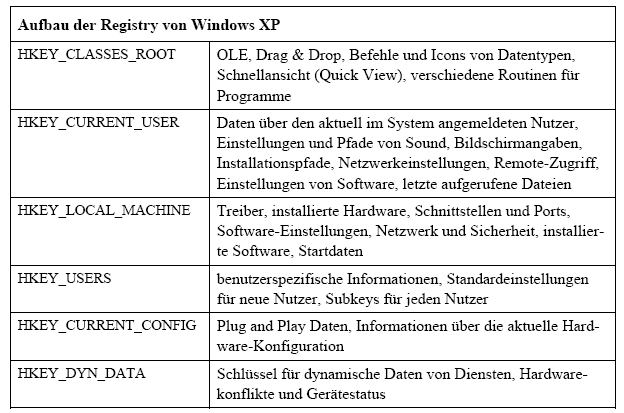Since Windows 95 the Registry133 was improved. Configurations of the system are stored and administered in logically connected form in a hierarchical central data base. The data are called over keys and are among themselves linked.