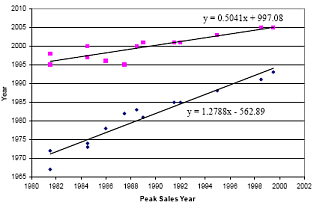 Leaving from these data, diagrammano the dates of introduction and phase-out according to the date in which the sale peak has been taken place; such points come then interpolated with two straight ones of which are gained, then, the expression analytics. The result that is obtained is brought back in the following image.