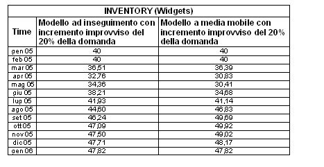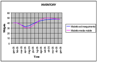 - Using instead, the mobile model to average happens that the waited for orders do not have an ascending course like in the event to pursuit, but oscillates in a range comprised between 10 and 12 widgets/week assuming values that are the averages of the orders attended in the considered period (20 weeks); consequently also the level of the warehouse has a similar course. After a decrease it begins them, the level of warehouse grows catching up a maximum of approximately 57 widgets (when the waited for orders catch up the peak of 12 widgets/week) going over the wished level. After that it begins to decrease coming down to of under of the wished level. If the period of simulation grew tall it would notice that the waited for orders would oscillate in a more and more narrow range around to 11 widgets/week, while the peaks minimums and maximums of the level of warehouse would be always approached more the wished level.