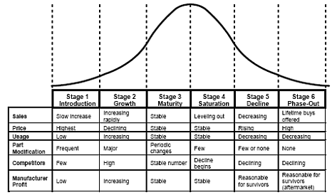 - Phase-out: A questo punto della vita di un componente le vendite e la capacità di servire il mercato raggiungono il più basso livello, finché le linee produttive non vengono dimesse del tutto.
