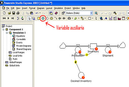 Figura 3.6- Desired Inventory è usato per decidere la percentuale di produzione. Esso è rappresentato da un ausiliare collegato alla produzione tramite un Link