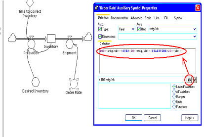 Questa equazione usa la funzione STEP per incrementare gli ordini da 100 a 120 widgets dopo 20 settimane della simulazione.