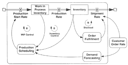 Il controllo della produzione e le decisioni prese a riguardo della gestione del magazzino dall'azienda includono order fulfillment (adempimento degli ordini che determina l'abilità di soddisfare gli ordini dei clienti in base all'adeguatezza del magazzino) e production scheduling (organizzazione della produzione che determina il tasso di produzione iniziale basato sulla previsione della domanda e sulla posizione del magazzino incluso il WIP inventory).