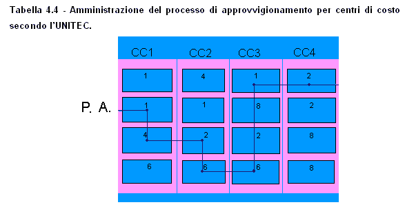 Ogni colonna della tabella corrisponde ad un centro di costo; i rettangoli all'interno di esse individuano specifiche attività;