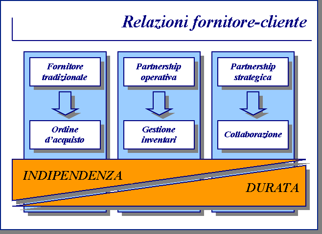 Fig. 1.2 : Evoluzione dei rapporti fornitore-cliente dalla semplice fornitura al rapporto di cooperazione nel SCM esteso, mettendo in evidenza il rapporto inverso tra dipendenza dei soggetti e durata del rapporto. [Atos, 2000]