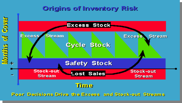 Al fine di evidenziare meglio le problematiche relative alla gestione del magazzino, qui di seguito (figura 1.7) viene riportata una schematizzazione della quantità di merce stoccata, che ne mette in evidenza l'andamento ciclico nel tempo. Tale andamento è determinato da flussi (streams) miranti a correggere eccessi di materie immagazzinate, alternate ad altre che, al contrario, cercano di porre rimedio a insufficienti livelli di stock; la prevalenza alternata delle due tendenze nel tempo, dipende in buona sostanza dalla quantità di beni che si prevede di vendere nel breve e medio periodo.
