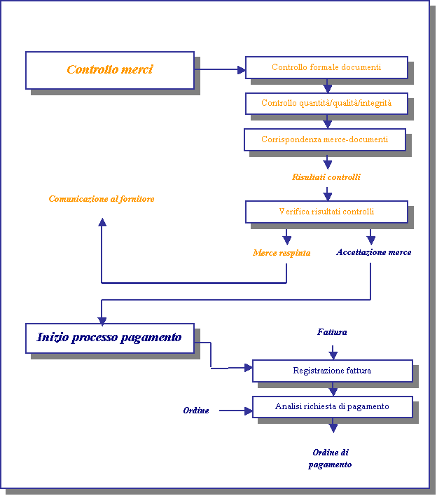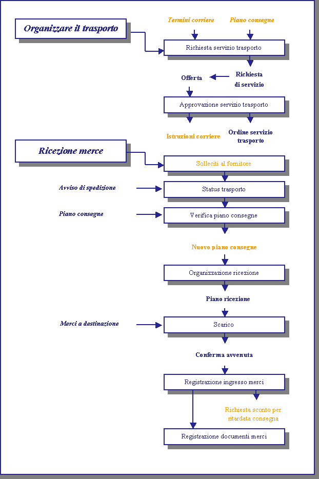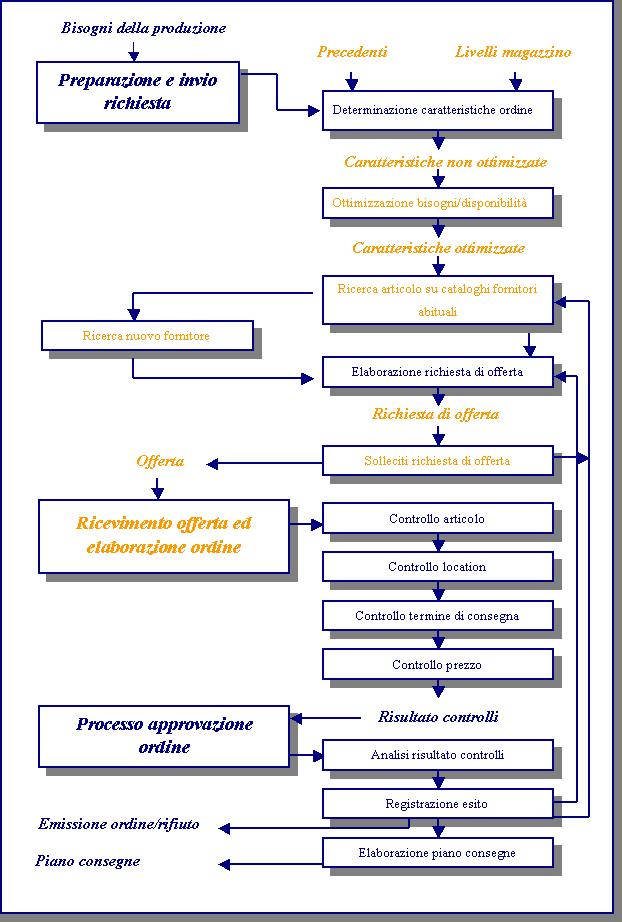Di seguito viene riportato uno schema formale rappresentativo della concatenazione degli "step" che in genere un'impresa, non inserita in un processo di SCM, segue per vedere consegnata la merce desiderata. Gli elementi del processo evidenziati in arancione, rappresentano quelli dove maggiormente la gestione integrata delle forniture incide, semplificando il processo stesso e permettendo, oltre ampi risparmi diretti in termini di tempo e costo, di liberare risorse umane ed economiche altrimenti impiegate nel processo formale.