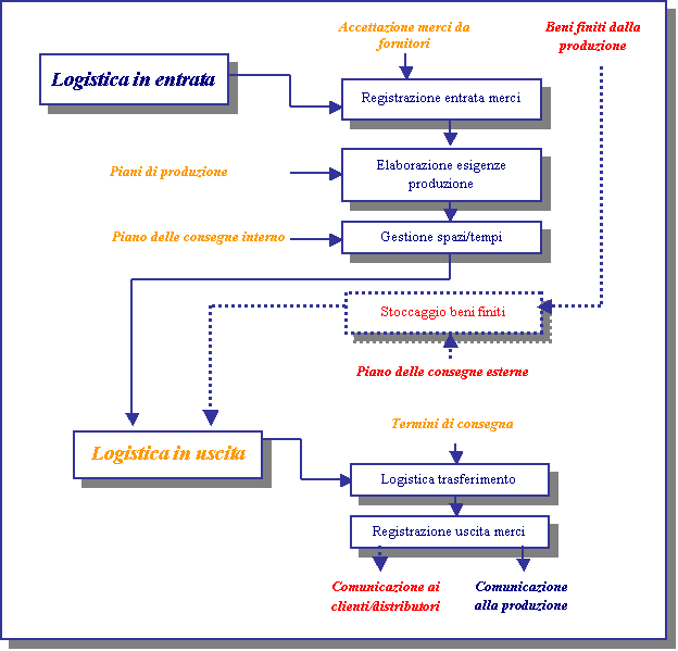 Si tratta dell’insieme di operazioni interne all’impresa che coinvolgono sia la logistica di magazzino che la spedizione delle merci verso i reparti di produzione. Le problematiche dello stoccaggio in magazzino della merce è di ampie proporzioni; infatti, al di là dei casi specifici di determinati settori, il capitale investito nella struttura fisica del magazzino, nella sua gestione, e nei beni in esso stoccati, ha una forte incidenza sui costi totali dell’impresa.