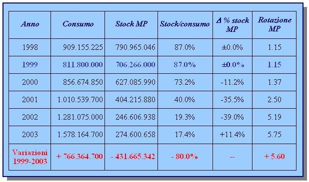 Nella tabella 2.2 vengono riassunti i risultati gestionali quadriennali di magazzino potenzialmente acquisibili da un impresa campione del distretto dei marmi, in termini di consumo, di quantità di materie prime stoccate, e di indici di rotazione se nel distretto venisse adottato il magazzino virtuale; da notare che l'aumento della produzione, deriva dall'acquisizione di più ampie fette di mercato, conseguenza della maggiore competitività raggiunta.