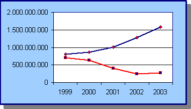 Fig. 2.3 : L'andamento in valore dei consumi (in blu) e dello stock di materie prime (in rosso). [Unitec GmbH, 2000]