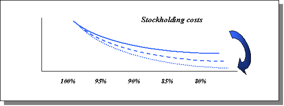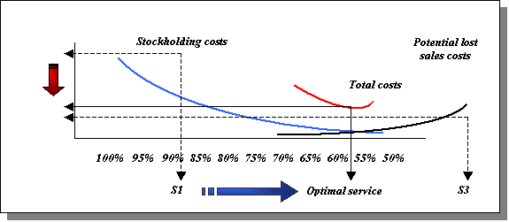 Ciò significa che, diminuendo la quantità di scorte al di sotto del "minimum cost" indicato nel grafico, sarebbe possibile ottenere dei risparmi, a discapito, però, di crescenti costi dovuti alla perdita di potenziali vendite. Riducendo troppo le scorte, d'altro canto, l'impresa diminuirebbe la sua capacità di produrre la quantità e la qualità della merce richiesta dal mercato (optimal service).
