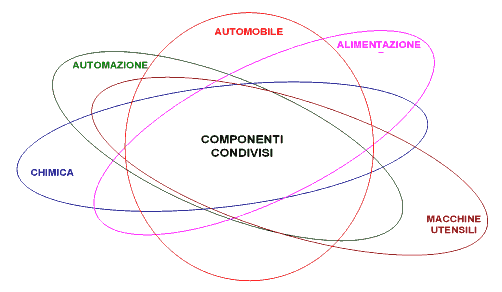 Nei paragrafi precedenti sono stati esposti i principi del magazzino virtuale e si è appena detto che Unitec opera in questo campo attraverso un'applicazione di NetSourcing. L'utilizzo di questa tecnologia, in questo caso, non viene tuttavia limitata ai soli gruppi o distretti industriali, ma viene estesa anche ad imprese appartenenti a contesti industriali diversi. Infatti, se il concetto di magazzino virtuale trova al sua prima, naturale, applicazione nel contesto di gruppi o distretti industriali - in quanto l'alto livello di condivisione delle componenti e delle conoscenze tecniche combinati con la vicinanza fisica ne rappresentano le premesse ideali per l'implementazione - bisogna anche aggiungere che un discreto livello di condivisione delle merce può essere presente, per taluni aspetti, anche in imprese appartenenti a diversi settori industriali, come si può comprendere dalla figura 3.13. L'area di intersezione comune rappresenta, infatti, le componenti di ricambi o di merci condivise.
