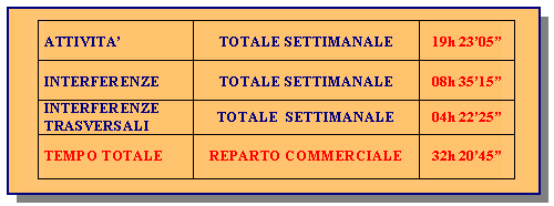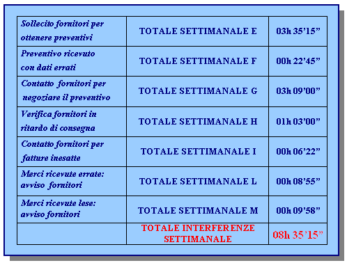 Come riportato nella tabella 4.10, il tempo settimanale delle interferenze che deve fronteggiare il reparto commerciale ammonta a poco più di 8 ore e mezza la settimana, cioè oltre il 40% del tempo dedicato alle attività di approvvigionamento normalmente svolte. I dati di riferimento sono esposti nel paragrafo 5.2, a pagina 213.