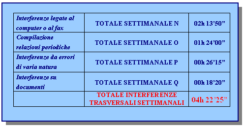 P/Q- Interferenze da errori di varia natura ed interferenze sui documenti. Si tratta di interferenze sempre presenti ma che risultano abbastanza limitate. Gli errori nella scrittura dati e le conseguenti correzioni del personale commerciale sono piuttosto ridotti rispetto alla mole di lavoro, pari a circa 26 minuti alla settimana e questo può essere spiegato con una migliore dimestichezza all'utilizzo del sistema. Inoltre nel reparto commerciale non si ricorre spesso a documenti in archivio, se non per verificare direttamente i dati di alcune fatture; per questo motivo, tale tipologia di interferenze richiede un tempo piuttosto limitato: appena 18 minuti e mezzo alla settimana. I dati sono riassunti nella tabella 4.11, mentre, per un'esposizione più precisa, si faccia riferimento al paragrafo 5.2, a pagina 216.