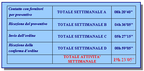 B- Ricezione dei preventivi. Una volta ricevuti i preventivi desiderati, questi vengono registrati - in modo da tenere aggiornato l'archivio di dati - e confrontati con i preventivi precedenti e/o con preventivi di fornitori concorrenti. Questo non succede sempre per tutti gli articoli; generalmente per i prodotti già acquistati altre volte ci si affida ai soliti fornitori, a meno che non si notino - nelle verifiche con preventivi precedenti - mutazioni negative nelle condizioni di acquisto, nel qual caso ci si rivolge a nuovi fornitori, che possono offrire condizioni migliori. Il risultato è che a fronte di circa 10 preventivi giornalieri, circa 7 sono gli ordini effettivamente richiesti. Questo tipo di operazioni necessitano circa 04h 36'05" settimanali.