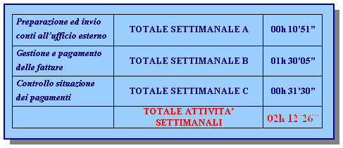 C- Controllo situazione dei pagamenti. Anche questa operazione giornaliera risulta estremamente più semplificata ed agevole da svolgere. Se non si verificano problemi, il tempo settimanale necessario per questo tipo di controllo si riduce a 31'30" (-45.5%).
