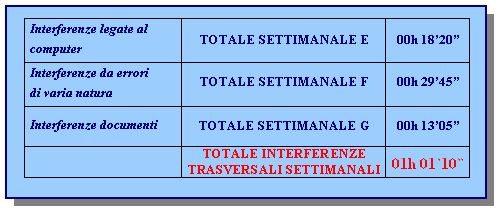 E/F/G- Interferenze legate al computer, ad errori di varia natura e sui documenti. Anche per il reparto amministrativo valgono le considerazioni fatte per le interferenze trasversali che si verificano negli altri reparti. Minori attività relative agli approvvigionamenti comportano anche una riduzione delle interferenze: minori possibilità di imbattersi in problemi di sistema o di software, minori errori nel trattare informazioni, minori difficoltà a trovare i documenti e i raccoglitori che si può far fatica a trovare subito. Nella tabella 4.42 sono riassunti i tempi stimati delle interferenze, nel caso l'impresa "A" ricorra alla fornitura integrata: il totale settimanale è valutabile in 1h 01'10" (-59.1%). I tempi ipotizzati sono riportati dettagliatamente nel paragrafo 5.3, a pagina 244.