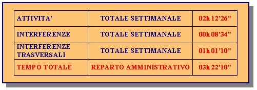 Il tempo che settimanalmente viene impiegato dal reparto amministrativo per gestire le attività inerenti gli approvvigionamenti, diventa pari a 3h 22'10", riducendosi del 75.4%. Di questo tempo, le interferenze totali assommano a circa il 34.5%. I dati riassuntivi sono esposti nella tabella 4.43.