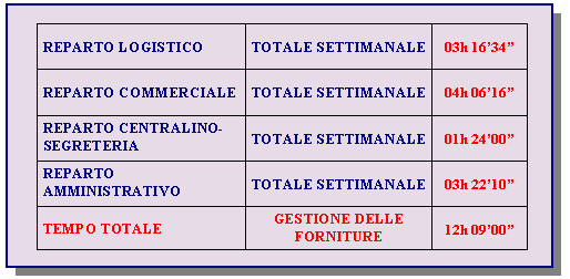 Ciò significa che il tempo lavorativo settimanale che i reparti coinvolti dedicano al trattamento delle forniture passa dal 32% ad appena il 6.0%. Nella tabella seguente vengono riportati i tempi stimati per reparto dedicati alle forniture.