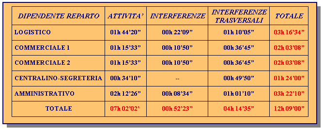 Anche il reparto logistico presenta un dato che pare in controtendenza rispetto agli altri reparti aziendali; la diminuzione delle attività, infatti, è pari al 42%, decisamente meno decisa rispetto agli altri valori che variano dal 79,5% all'87%. Il motivo risiede nel rapporto tra attività ed interferenze dell'ente: contrariamente agli altri reparti, infatti, la maggior parte del tempo è normalmente speso per le interferenze dirette - 5 ore e 11 minuti settimanali pari al 47.5% del tempo totale - mentre le attività vere e proprie occupano, secondo quanto rilevato direttamente, un tempo più ridotto - circa tre ore -; il taglio rispettivamente di 4 ore e 49 minuti e di 2 ore e 17 minuti, conseguentemente, comporta una riduzione percentuale nettamente maggiore delle interferenze rispetto alle attività.