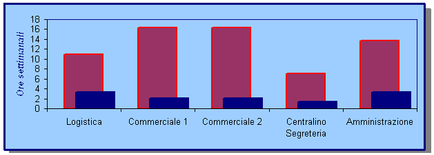 Fig. 4.46 : Rappresentazione dei tempi impiegati ogni settimana dai dipendenti dei diversi reparti per al gestione delle forniture, prima - in rosso - e dopo - in blu - la fornitura integrata.