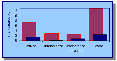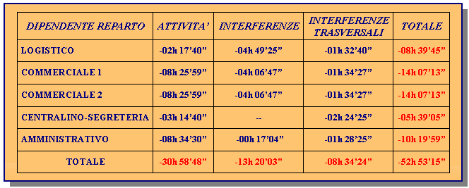 La riduzione della interferenze trasversali, come si può notare, risulta relativamente meno pronunciata rispetto alle attività e alle interferenze dirette. In quasi tutti gli enti aziendali queste diminuiscono in maniera sorprendentemente omogenea di circa un'ora e mezza, con l'eccezione del reparto centralino segreteria, che tuttavia, non presentando alcun tipo di interferenze dirette, è da considerare, sotto questo punto di vista, un caso un po'a parte. Ciò è dovuto, contemporaneamente, sia al fatto che, in partenza, le interferenze trasversali hanno un valore di tempo più basso rispetto alle attività ed alle interferenze dirette, sia al fatto che esse sono legate a fattori che non vengono del tutto eliminati estenalizzando la gestione delle forniture e comunque meno sensibili al diminuito volume di lavoro.