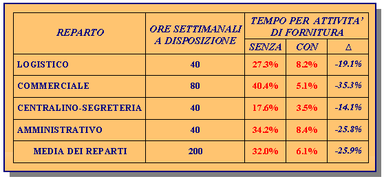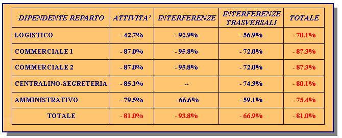 In particolare, gli enti aziendali che maggiormente ne trarrebbero vantaggio sarebbero, nell'ordine, il reparto commerciale, il reparto centralino-segreteria, il reparto amministrativo e quello logistico. Nel primo e nel quarto, si potrebbero verificare forti riduzioni soprattutto delle interferenze dirette, negli altri due, invece delle attività. Questo differente comportamento dipende in gran parte dalla natura delle mansioni svolte: il reparto centralino-segreteria, così come l'amministrazione, risulta maggiormente sensibile al variare dei volumi di informazioni trattati, ed infatti, per questi enti, sono le riduzioni di tempo relative alle attività a contribuire in modo determinante alla riduzione dei tempi; il reparto logistico e quello commerciale, invece in media, dimostrano di trovare particolare giovamento soprattutto dalla diminuzione delle interferenze dirette.
