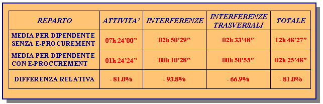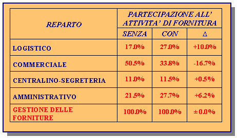 A riprova di ciò, basta rifarsi ai dati delle tabelle 4.47 e 4.48: ogni addetto del reparto commerciale risparmia più di 14 ore settimanali (2 ore e 48 minuti al giorno), riducendo cioè le mansioni connesse agli approvvigionamenti mediamente dell'87.3%. Ciò è determinato congiuntamente da una forte riduzione delle attività (-87%) e della relative interferenze, che diminuiscono più che proporzionalmente di ben il 95.8%. Per quanto riguarda le sole attività dirette connesse agli approvvigionamenti, è l'addetto al reparto amministrativo a risparmiare più tempo con più di 8 ore e mezzo alla settimana; tuttavia se considerate in rapporto al monte ore totale, la diminuzione è pari a quasi l'80%. E' da notare che l'amministrazione, pur caratterizzata già in partenza da interferenze dirette piuttosto basse, con la fornitura integrata è riuscita comunque a ridurne la misura di due terzi.