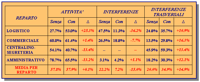 Come si può capire dalla figura 4.56, si tratta di una tendenza generale, anche se vi sono alcune eccezioni. Prendendo in considerazione le variazioni presentate dal reparto logistico, ad esempio, si può notare come aumenti di molto la percentuale delle attività interconnesse agli approvvigionamenti, proprio perché in questo reparto, più che in ogni altro, vengono tagliate soprattutto molte interferenze dirette.