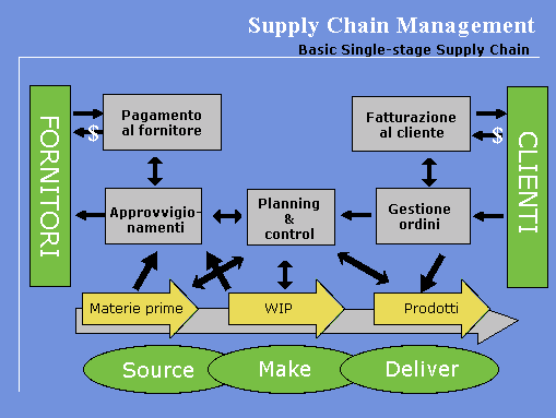 "il Supply Chain Management è un approccio integrato, orientato al processo per l'approvvigionamento, la produzione e la consegna di prodotti e servizi ai clienti. SCM gestisce le relazioni con i sub-fornitori, i fornitori, le operazioni interne, gli intermediari, i distributori ed il cliente finale. SCM comprende la gestione delle materie/semilavorati/prodotti finiti e dei flussi di informazione ed economici." [MIT]