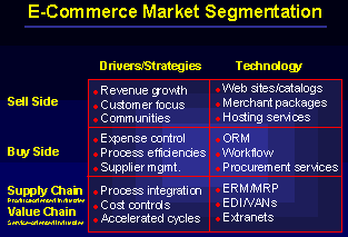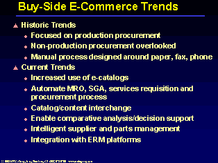 Fino ad oggi l'e-commerce è stato focalizzato sul sell-side. Le applicazioni dedicate alle gestione delle vendite in rete sono numerosissime. L'offerta di ogni produttore di applicazioni aziendali, sia tradizionale che "new provider", ne contiene almeno una specifica. Ormai questo mercato è arrivato ad un livello prossimo alla saturazione.