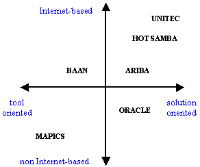 Nello schema seguente è stato riportato il posizionamento di sei produttori (vedi Cap. 2) sul mercato delle applicazioni per gli approvvigionamenti. Sull'asse delle ordinate è stata posta la distinzione tra quelle basate su tecnologia Internet e quelle con strutture di altro tipo. Sull'asse delle ascisse, per "solution oriented" si intendono prodotti studiati appositamente per gli approvvigionamenti MRO and non-production goods per componenti elettronico-meccanici; i prodotti "tool oriented" sono invece utilizzabili nelle aziende di tutti i settori industriali.