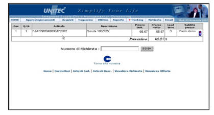 In questa sezione è possibile inviare la richiesta ad Unitec, in base agli articoli precedentemente selezioni nelle sezioni