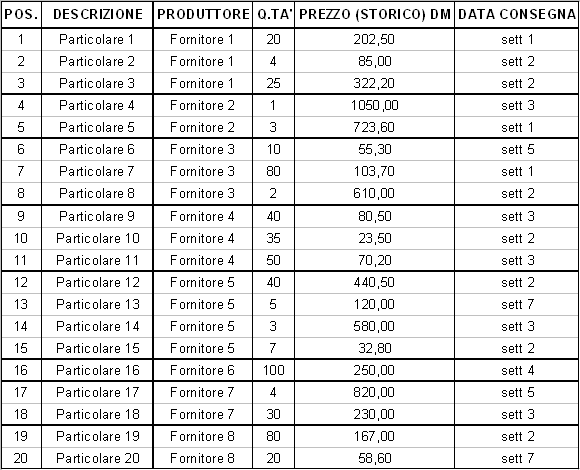 Dall'analisi della tabella appare immediatamente come un unico documento, sia esso ordine o richiesta, riesca ad integrare il contenuto informativo che, secondo una normale prassi di acquisto, dovrebbe comparire in almeno otto diversi documenti, tanti quanti sono i nomi dei fornitori componenti la tabella.